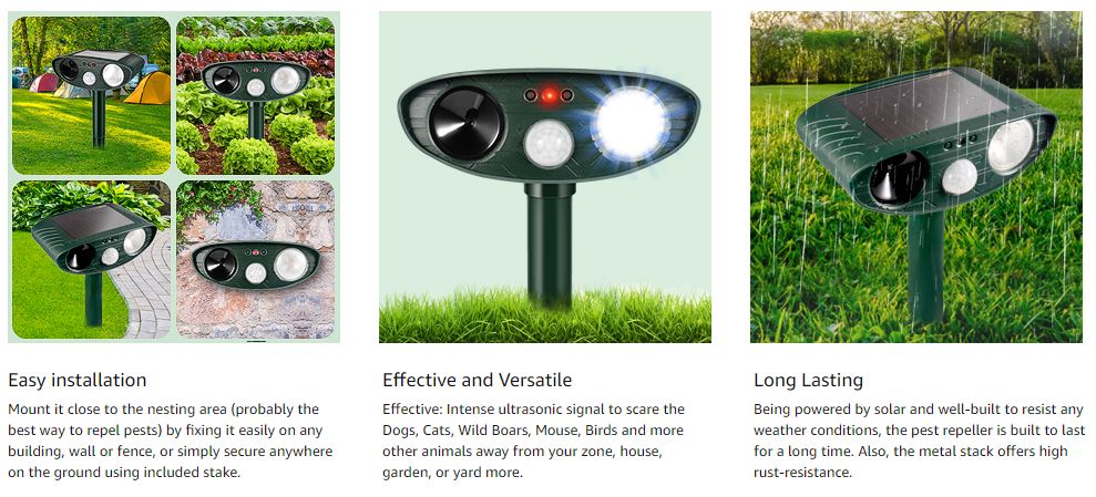 - ENVIRONMENTAL FRIENDLY AND EASY TO USE: Naturally drives skunks and other animals out without killing them. Made of anti-UV and waterproof material, suitable for all weather conditions. SOLAR energy technology, charge itself under sun, wireless and rechargeable. Don't worry about getting new batteries anymore! Repeller features FLASHING light to scare the animals.