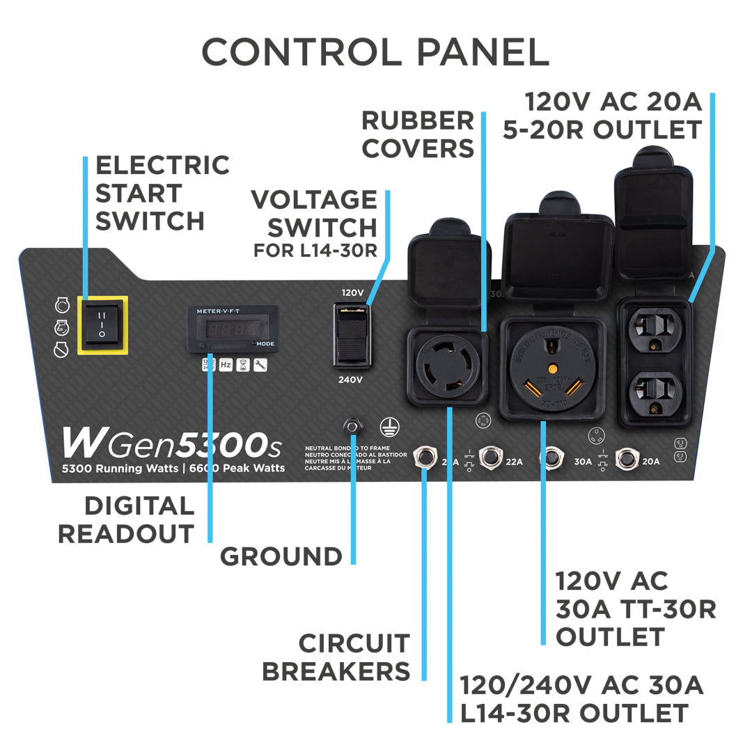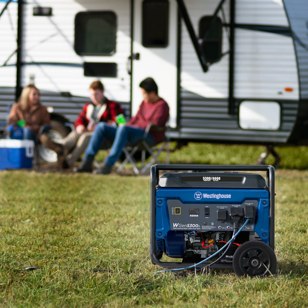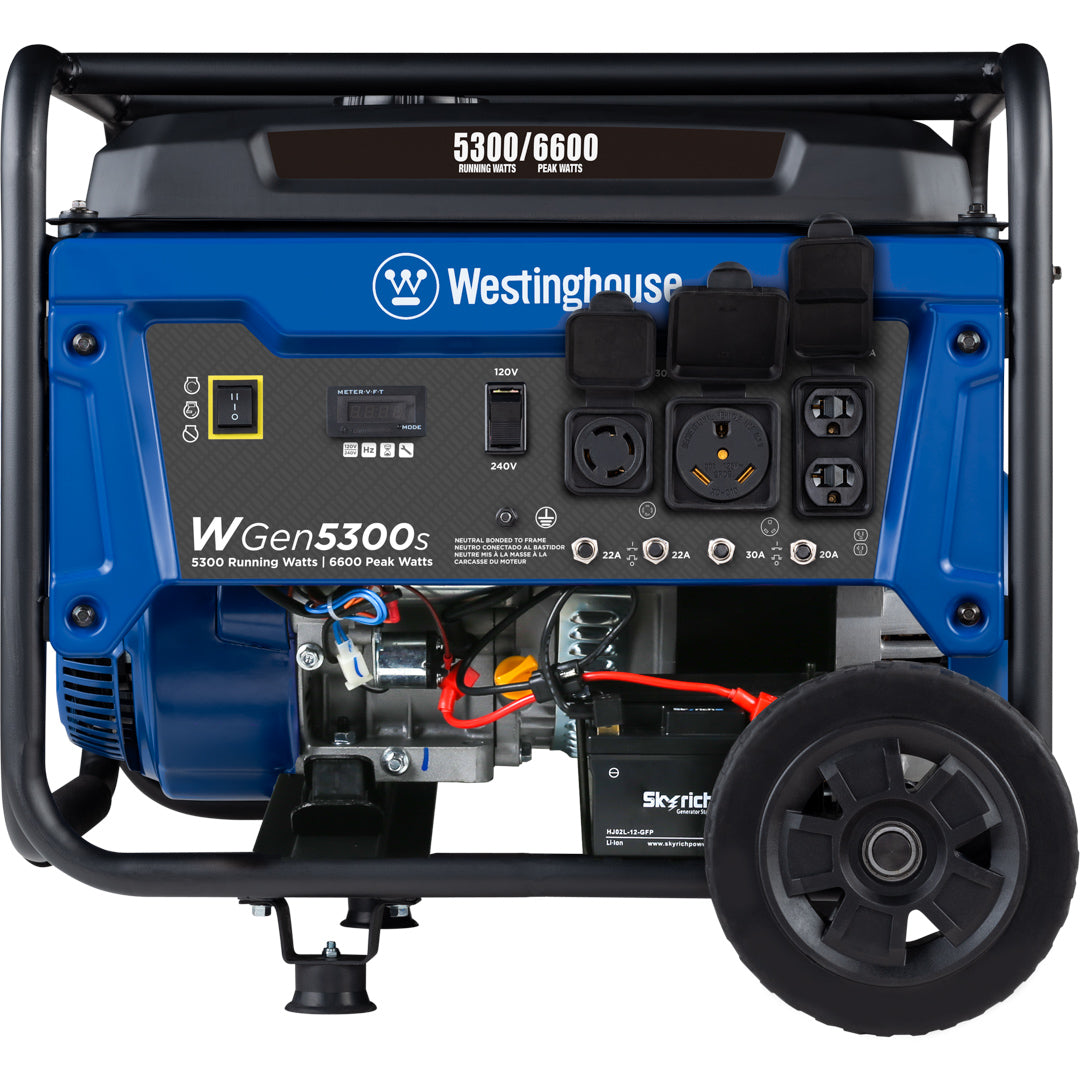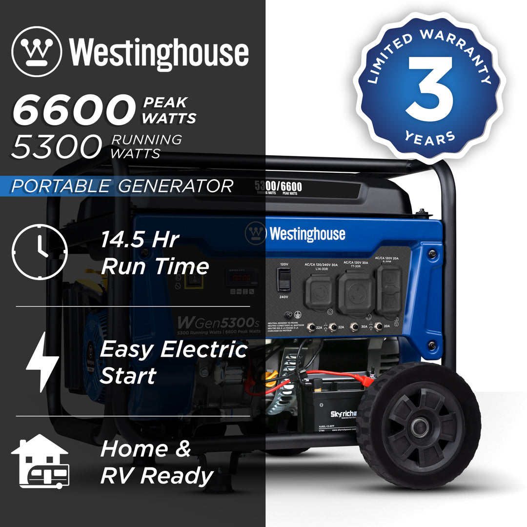 The Westinghouse WGen5300s is a versatile solution for all your power needs from your home to your travel trailer when you’re looking for a dependable backup power supply. The WGen5300s produces 6,600 peak watts and 5,300 running watts with a powerful 274cc 4-Stroke OHV Westinghouse Engine constructed for durability. Running for up to 14.5 hours on a 4.7 gal. (18L) tank of gas, it's conveniently equipped with a built-in fuel gauge, automatic low oil shutdown, and electric start with manual choke. The L14-30R outlet is Transfer Switch Ready for total household power and eliminates the hassle for annoying extension cords or power strips. Combined with an RV Ready TT-30R outlet, all this generator needs is a one cord hookup to ensure your recreation vehicle or home is ready to go for air conditioners, refrigerators, sump pumps, and home necessities. The intuitive control panel includes the Digital Readout to share real-time updates on maintenance information, making it easy to care for the WGen5300s with long life and lasting utility. Engineered into a compact hardened-steel frame with added roll bars, foam grip handle, and never-flat wheels, it lets you easily move this generator from storage to use. The WGen5300s Portable Generator is complete with a 3-Year Limited Warranty and Lifetime Technical Support to ensure your confidence can be backed by our nationwide customer service and support network.